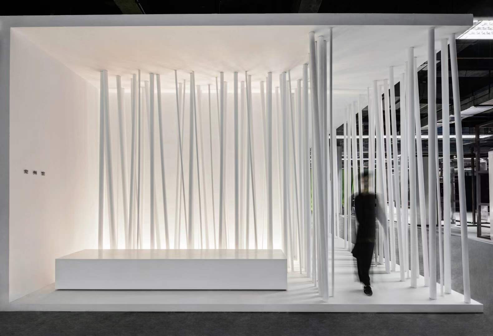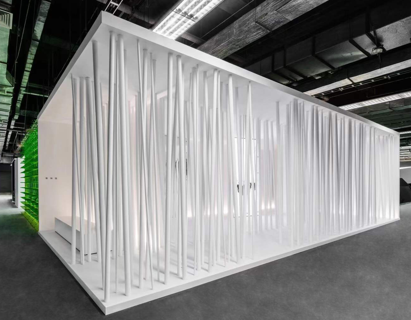 展位运用简洁的线、面结构,为空间提供思考媒介。空间中自由交错的白色立柱,是对“江南竹林秘境”的抽象化表达。以沉浸式影像释放内在能量,将生活的畅想转化为可感知的视觉语言,激发不可复制的生命力。