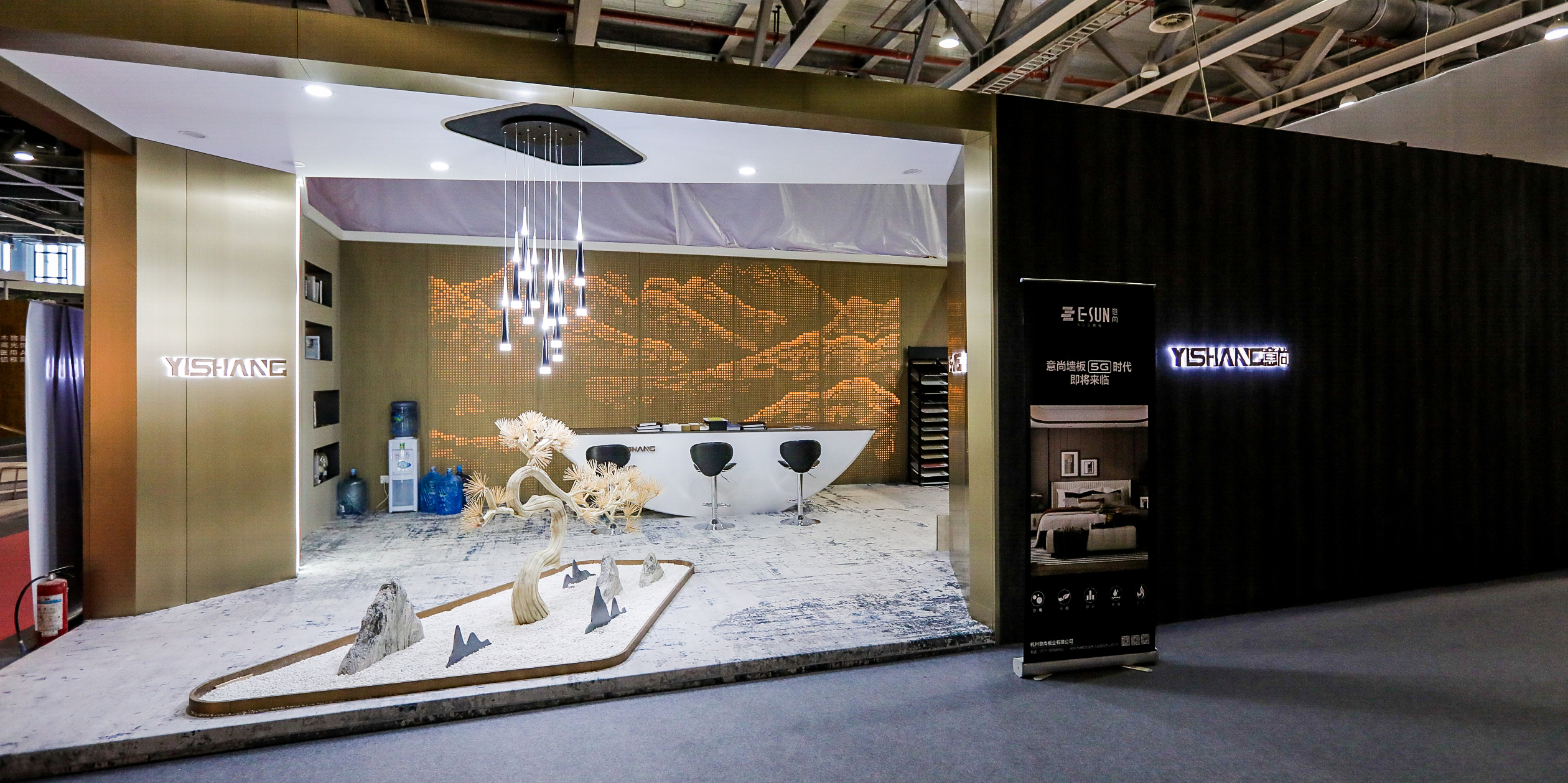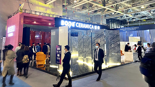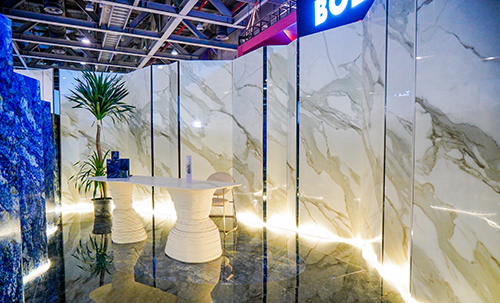 展位设计以新颖的方式结合了视觉艺术、空间设计、光线等多种艺术方式,重塑新的空间理念。以新材料作为突破点,通过各种大规格产品与充满神秘感的艺术元素相结合,打破固有空间的物理界限,让参观者在空间里去探索未来家居的新境界以及思考人与自然该如何自然相处。