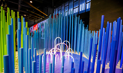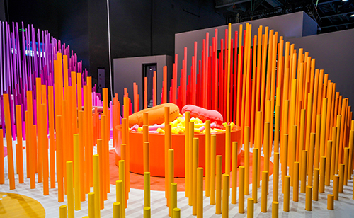 设计摒弃了常规的展厅墙体,将阵列穿插的圆管延伸至整个展厅空间,通过安插不同高度的圆管制作出立体起伏的山川造型,并以MF品牌多样化的渐变色彩为基础,将展台拼装成一幅立体的彩色山水画。