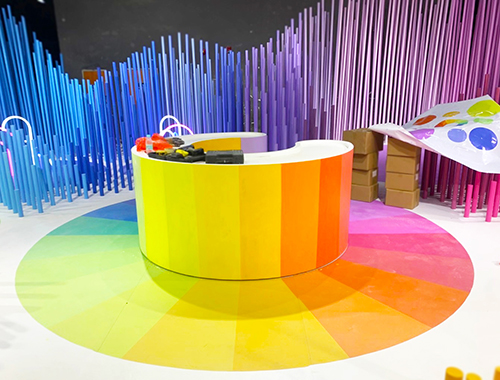 通过多彩渐变的颜色、多变的造型,将此空间赋予色彩的空间座位浮夸般的外衣,但同时又能集休息、交流、观展与学习为一体。以山水、丛林为主要设计元素,唤醒每一位观众对色彩与设计之于家居生活中的魅力影响,打造的可供“坐下来”的有“座位”功能的体验设计展。